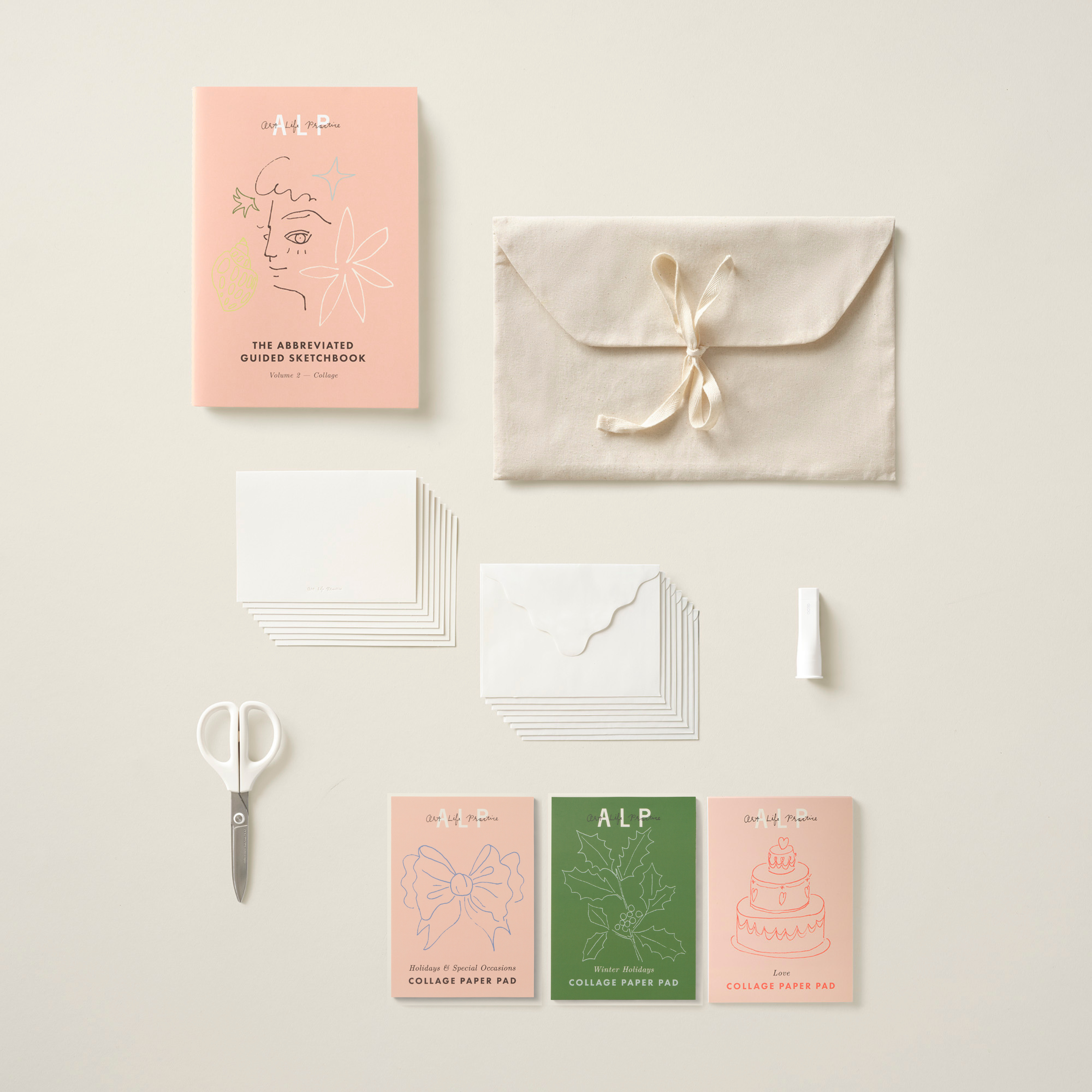 The Collage Starter Kit comes with everything you need to begin a collage practice –– complete with materials, instruction, and accessible creative prompts. Perfect for mood boards, greeting cards, and other DIY collage projects.